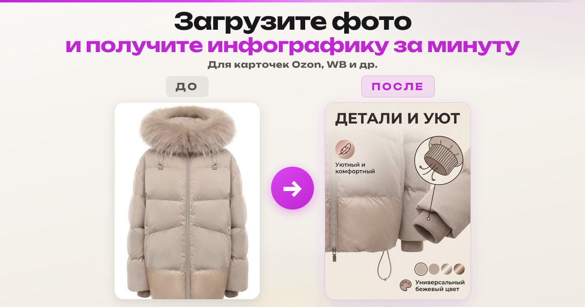 Загрузите фото товара и получите 4 готовых слайда для карточки товара на маркетплейсе.